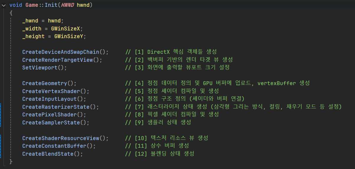 CreateDeviceAndSwapChain(); // [1] DirectX 핵심 객체들 생성